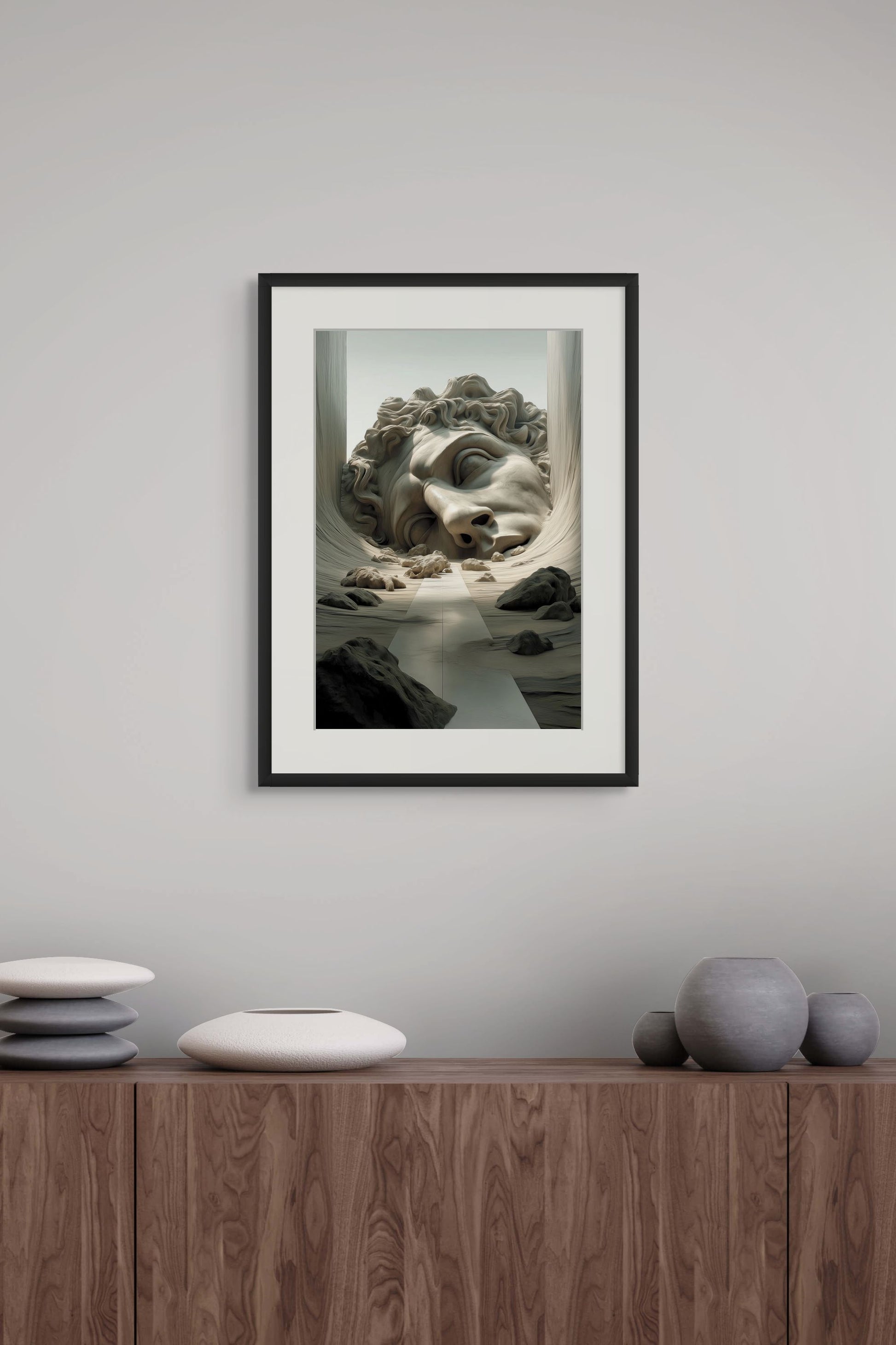 Equality reveals a monumental face carved into a desolate canyon, its serene expression lying between strength and surrender. The colossal form, partially buried in stone, evokes both ruin and rebirth, confronting viewers with themes of balance, humility, and shared humanity. The stark pathway leading toward the sculpture suggests a journey into the collective unconscious, where ideals of justice and unity reside. At 18 x 12 inches, this signed limited edition bridges mythic grandeur with contemporary reflection, inviting collectors to explore the fragile equilibrium of existence.